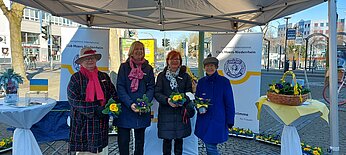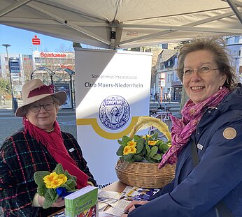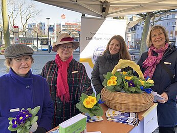 Um noch mehr Moerserinnen auf unsere Arbeit und unsere Projekte am Niederrhein aufmerksam zu machen, verteilten unsere Clubschwestern am Weltfrauentag zusammen mit der Moerser Gleichstellungsbeauftragen Jacqueline Rittershaus in der Innenstadt kleine Blumengrüße. Dabei haben wir auch Geld für die Partnerclubs in der Ukraine gesammelt, um dort Kinder und Frauen in ihrer akuten Notlage zu unterstützen.