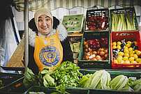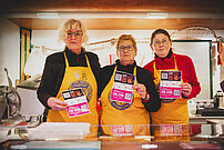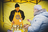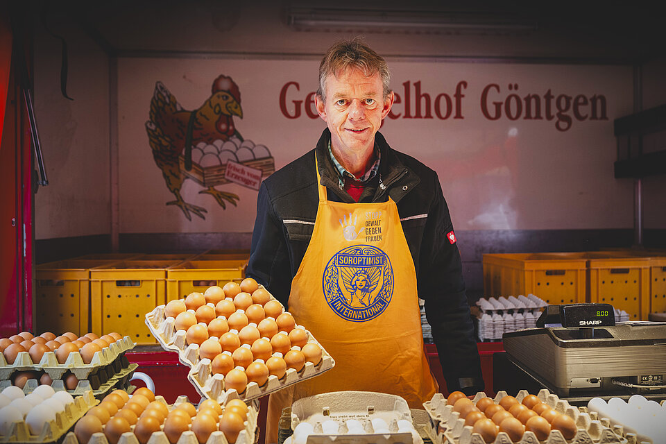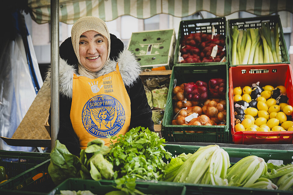 Die Betreiber der Markstände in Moers wurden von uns mit orangen Schürzen ausgestattet, die sie gerne an dem Markttag trugen. So wurden auch die Marktbesucher auf die Problematik aufmerksam gemacht. Wir haben zusätzlich an einem Infostand am Rathaus und in der Fußgängerzone der Stadt Moers über die Problematik, die Aktionen und die Notfallrufnummern aufgeklärt und Mandarinen an Passanten verteilt, um Aufmerksamkeit zu erhalten.